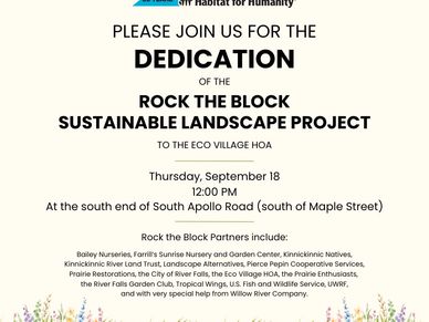 This Rock the Block project is a collaborative effort with the Kinnickinnic River Land Trust, the U.S. Fish and Wildlife Service, Bailey Nurseries, University of Wisconsin-River Falls, Willow River Company, the Eco Village Homeowner's Association and St. Croix Valley Habitat for Humanity that is designed to improve the green spaces surrounding the Village community for all to enjoy. It will include placement of a permanent trail along the Oak Savanna on the East side of the Village, with a focus on the planting of fruit trees as well as low-maintenance native grasses and flowers - benefitting the community, the Kinnickinnic watershed, and its wildlife!